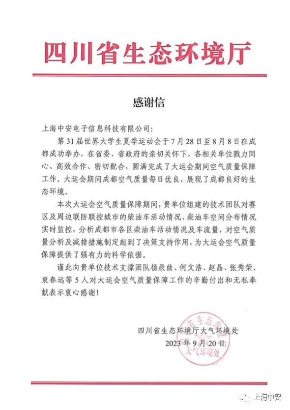 上海市生態(tài)環(huán)境局致上海中安的一封感謝信?。?025-01-10)