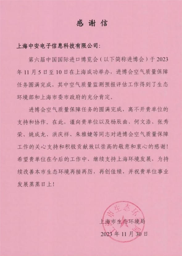 上海環(huán)監(jiān)中心就中安科技在21年國際進博會空氣質量監(jiān)測預報工作中杰出貢獻送來感謝信?。?021/12/31)